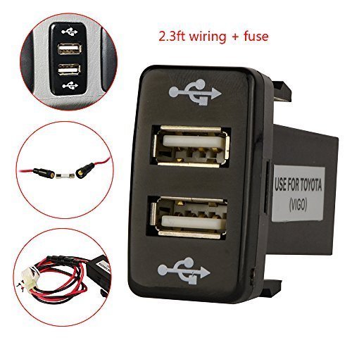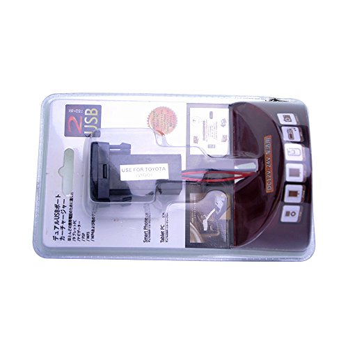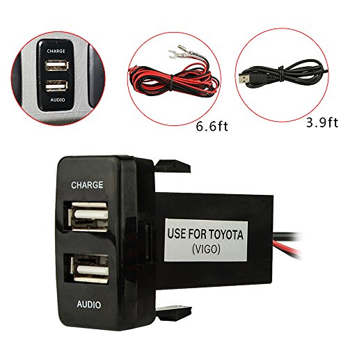 Input: 12V-30V; output: dual 5V 2.1/1.1A, works great as a replacement or extra dual USB charger in Toyota. 2.3ft wiring and fuse included.