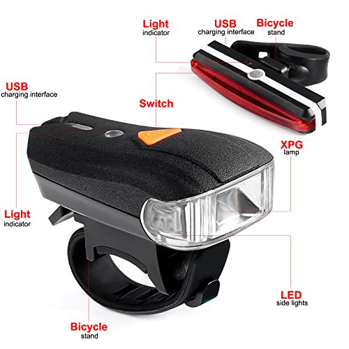 -. Feature : ULTRA BRIGHT LIGHT SET: Combination Lights, More Valuable! Keywell combines the powerful 400 lumens USB rechargeable bike front light and 100 Lumens LED red taillight together to break the light limitation to making your ride much safer! / USB RECHARGEABLE & WATERPROOF: Never Waste Your Money on Batteries Again! Both Headlight and Taillight can be charged in any USB port. Running time can be lasted from 2 hours to 24 hours after 2 hours full charged which will help your safety Long distance ride. Both rainproof to ensure a safe ride even in the raining weather! / INTELLIGENT LIGHT SENSOR: Intelligent Design, More Friendly to Use! The front light can change its proper brightness base on the current lighting situation when Automatic Light Adaptation mode. Turn off automatically after 3 minutes. 5 different modes for the front light and 6 modes for the bike rear light. / UNIVERSAL FIT & EASILY MOUNT WITHOUT TOOLS - Both Headlight and Taillight come with a very straightforward mounting bracket. Slide out the lights for quick removal and recharging. The front light can be carried as flashlight. The taillight fits virtually ANY bike frame, fork, seat post, handlebars, helmet, and more. / MONEY BACK & WARRANTY: Order Without Any Risk! 2 year quantity warranty and 60 days money back are promised.