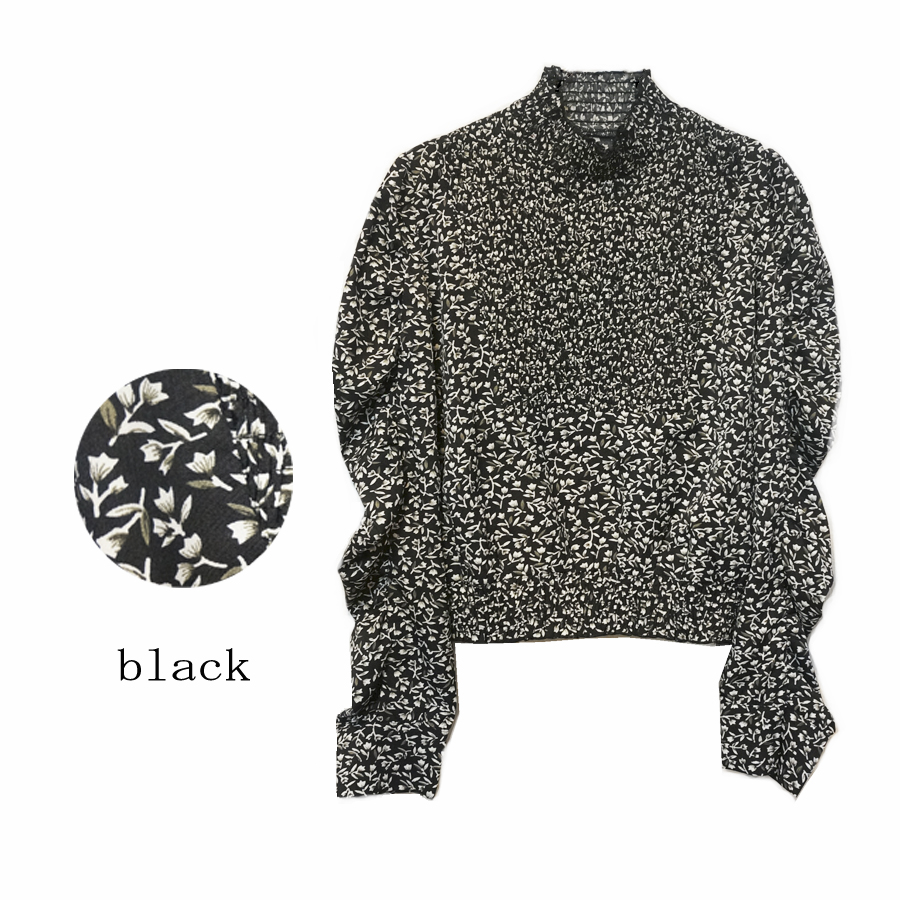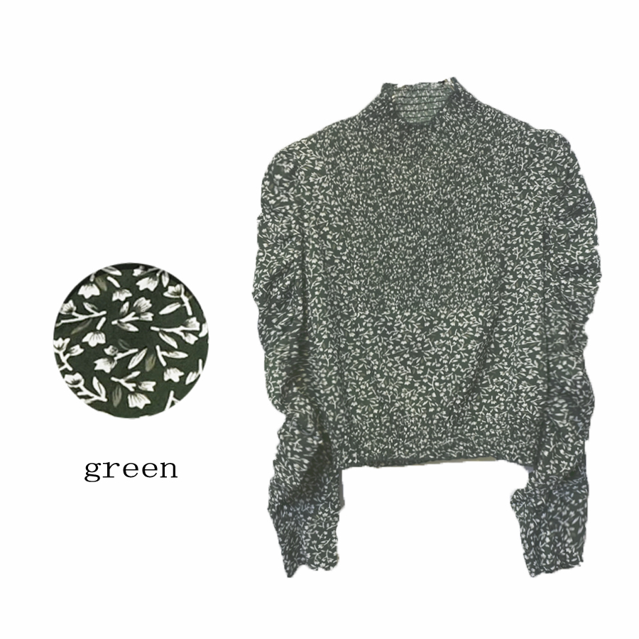 スタンドカラー、胸部分、ウエストがシャーリングになっているブラウス。