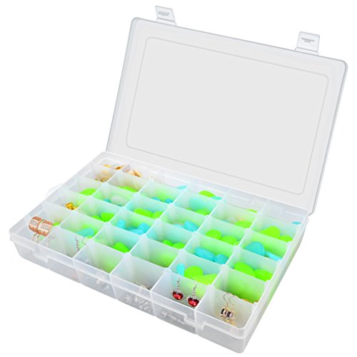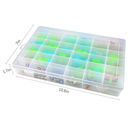 SIZE: The dimension of the box is 10.8 x 7 x 1.7 inches/27.5 x 17.8 x 4.3 cm (L*W*H). Each grid size is 1.8 x 1.2 inches/4.5 x 3 cm. Simple and Practical, suitable for storing earrings, rings, beads and other mini goods. Clear color can let you find your wants easily.