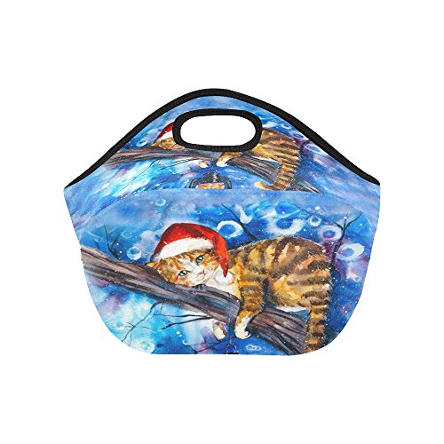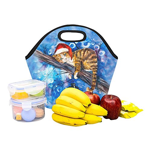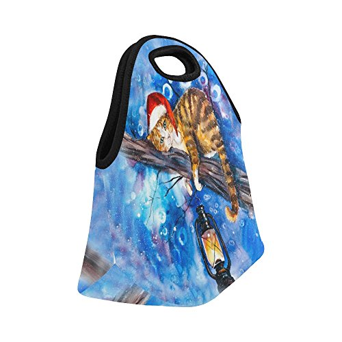 InterestPrint Insulated Lunch Tote Bag Watercolor Cute Cat Light Reusable Neoprene Cooler, Christmas Winter Snow Portable Lunchbox Handbag for Men Women Adult Kids Boys Girls