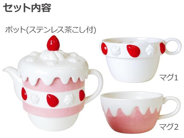 | いちごのショートケーキのティーポットとマグ2個のセットです。重ねて収納できるので場所をとらず便利です♪ギフトにもオススメです。 |
