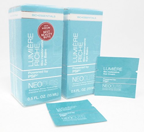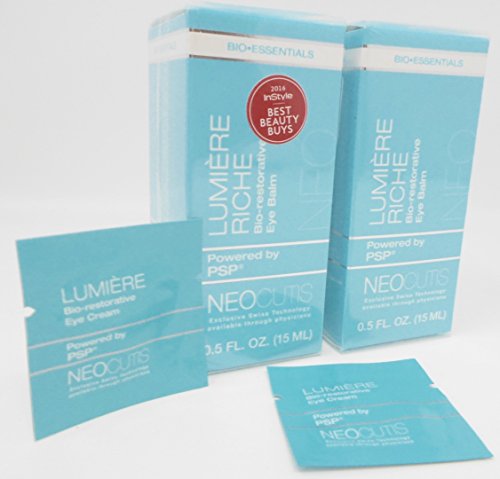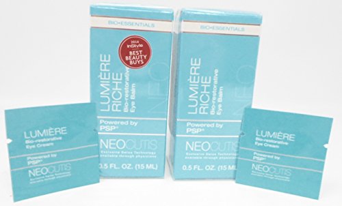 Minimize the appearance of sagging and mid-life textural changes with Wild Yam Extract. Dry skin: Ophthalmologist and Dermatologist tested • Free of color additives and fragrances • Not tested on animals For external use only. Do not use on damaged or broken skin. When using this product keep out of eyes. Rinse with water to remove. Stop use and ask a doctor if rash occurs. Keep out of reach of children. If product is swallowed, get medical help or contact a Poison Control Center right away riche bio-restorative eye balm with psp is a luxuriously intensive hydrating balm. Formulated with exclusive psp ( processed skin proteins), this naturally balanced mixture of essential skin nutrients including growth factors, interleukins and anti-oxidants, helps rejuvenate the appearance of skin. Psp combined with caffeine, bisabolol and sodium hyaluronate help address the signs of stress, puffiness, hydration and undereye darkness. Lumiere Riche Bio-restorative Eye Balm with PSP Anti-Aging, 0.5 Fluid Ounce (2-Pack) (2) Neocutis Lumiere Bio-restorative Eye Cream SamplesFeature