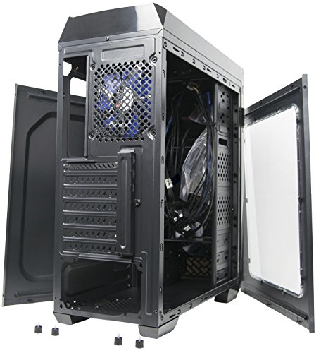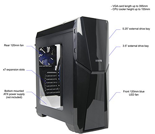Brand new ATX Mid-Tower PC case "Athena" (CASE-V04) from VIVO! Designed for gamers, this stylish performance case offers a variety of features including excellent air flow and cooling, an abundance of expansion, USB 3.0 compatibility, easy access thumb screw mounted side panels, and a large side window to show off your system. The case comes with front-back and top vents and mounts up to four fans. One front 120mm blue LED fan and one back 120mm fan are included.