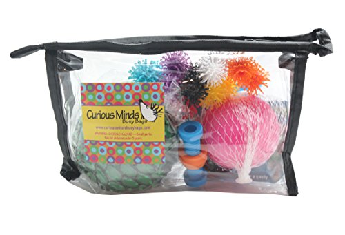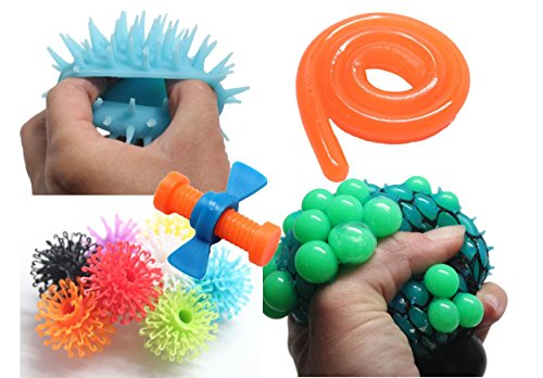 This set contains: Stretchy String - a super long coiled string that can be stretched out forever (almost) Great for hand strength and bilateral coordination. (Includes 1 random color) Inside Out Ball - This small 2" silicone ball is 2 balls in one. One side is a smooth ball, and you can flip it inside out to make it a spiky ball, making it a perfect fidget toy. The ball is also stretchy, so you can fold it over your hand or objects. You can clean your ball to restore it to its original condition if it gets dirty by washing with soapy water and applying talcum powder. (Includes 1 random color) Pencil Topper - A mini nut and bolt pencil topper - pop this mini spinning nut and bolt toy on top of your pencil and spin it up and down the bolt. Style of nut and colors will vary. (Includes 1 random color) Clinging Orbs - These little colorful balls are so much fun. They have little arms with hooks that allow them to cling to each other. You get 14 plastic balls ready to go with you wherever you go. WARNING - WARNING - These little guys are awesome but can get stuck in hair! They are like burs with hooks so make sure you supervise children with long hair!!! Mesh Bubble Ball - This fidget ball is a fun tactile toy that you cannot put down. The ball is filled with a colored slime which is encased in a colored shell. It is then wrapped with a fabric mesh so when you squeeze it, the slime pops through the mesh creating these addicting little balls that you can poke back in or simply release your grip and they will all pop back in leaving an alluring sound! So addicting! Ages 5+. (Includes 1 random color) Please note that these balls do not last long with rough play. If you squeeze really really hard, the mesh will begin to dig into the colored lining of the ball and create little holes that slime can slowly escape.Feature