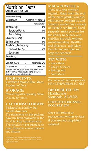 Beneficial nutrients: Healthworks Maca Root Powder is high in Protein, Fiber, Vitamin C, B Vitamins, Calcium, Iron, Potassium, Copper, Manganese and Fatty Acids.