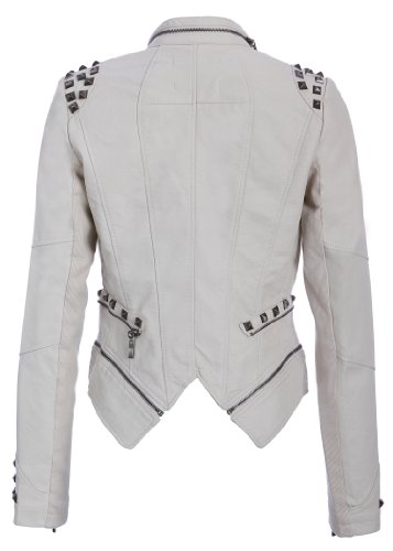 -. Binding : Textilien -. Brand : Pretty Attitude -. Color : Weiß -. Department : Damen -. Feature : Creme weiße Moto Jacke aus PU Kunstleder / Verziert mit stylischen Nieten / Erhältlich in Gr. S, M und L -. ProductGroup : Apparel -. ProductTypeName : OUTERWEAR -. Title : Rockige creme weiße PU Kunstleder Moto Jacke mit Nieten Spikes