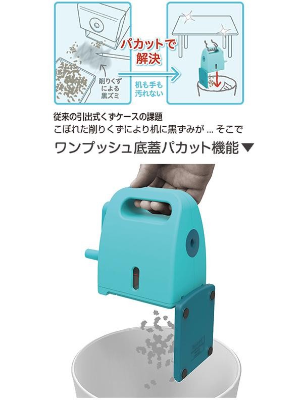 | 片手でワンプッシュ!!削りくずを直接ゴミ箱にパカッと捨てられる机を汚さない鉛筆削り器です。持ち運びに便利なグリップとコンセントが無くても使える手動式なので、リビングや子供部屋など、使用シーンを選びません。 |
