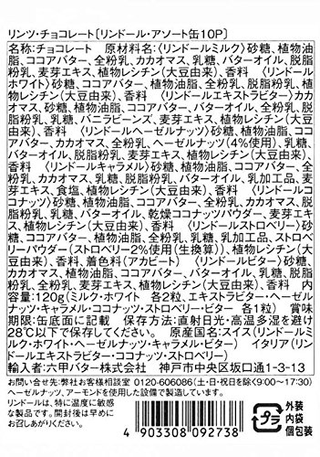 原材料:<リンドールミルク>砂糖、植物油脂、ココアバター、全粉乳、カカオマス、乳糖、バターオイル、脱脂粉乳、麦芽エキス、植物レシチン(大豆由来)、香料 <リンドールホワイト>砂糖、ココアバター、植物油脂、全粉乳、脱脂粉乳、植物レシチン(大豆由来)、香料 <リンドールエキストラビター>カカオマス、砂糖、植物油脂、ココアバター、バターオイル、全粉乳、脱脂粉乳、乳糖、バニラビーンズ、麦芽エキス、植物レシチン(大豆由来)、香料 <リンドールヘーゼルナッツ>砂糖、植物油脂、ココアバター、カカオマス、全粉乳、ヘーゼルナッツ(4%使用)、乳糖、バターオイル、脱脂粉乳、麦芽エキス、植物レシチン(大豆由来)、香料 <リンドールキャラメル>砂糖、植物油脂、ココアバター、全粉乳、カカオマス、乳糖、脱脂粉乳、バターオイル、乳加工品、麦芽エキス、食塩、植物レシチン(大豆由来)、香料 <リンドールココナッツ>砂糖、植物油脂、ココアバター、全粉乳、カカオマス、脱脂粉乳、乳糖、バターオイル、乾燥ココナッツパウダー、麦芽エキス、植物レシチン(大豆由来)、香料 <リンドールストロベリー>砂糖、ココアバター、植物油脂、全粉乳、乳糖、乳加工品、ストロベリーパウダー(ストロベリー2%使用(生換算))、植物レシチン(大豆由来)、香料、着色料(アカビート) <リンドールビター>砂糖、カカオマス、植物油脂、ココアバター、バターオイル、乳糖、脱脂粉乳、全粉乳、麦芽エキス、植物レシチン(大豆由来)、香料