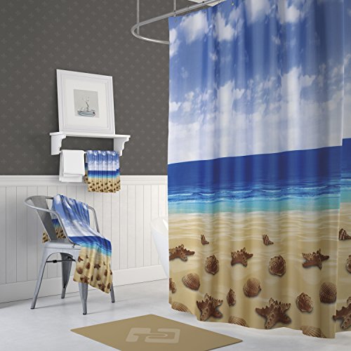 Fabric Beach Shower Curtain with Hooks, Tropical Island Ocean Landscape Starfish Hawaiian Style for Bathroom, Blue Brown 72 x 78 Inches