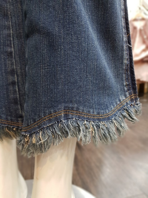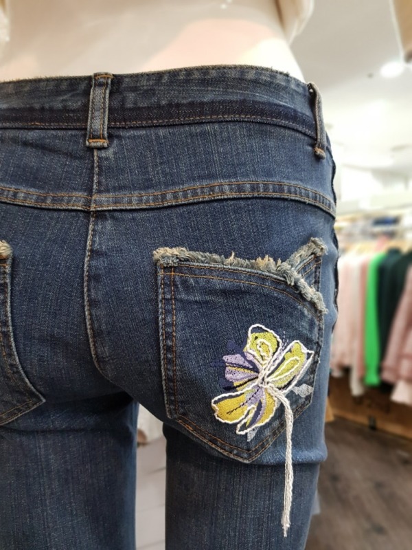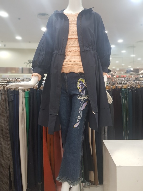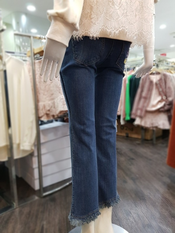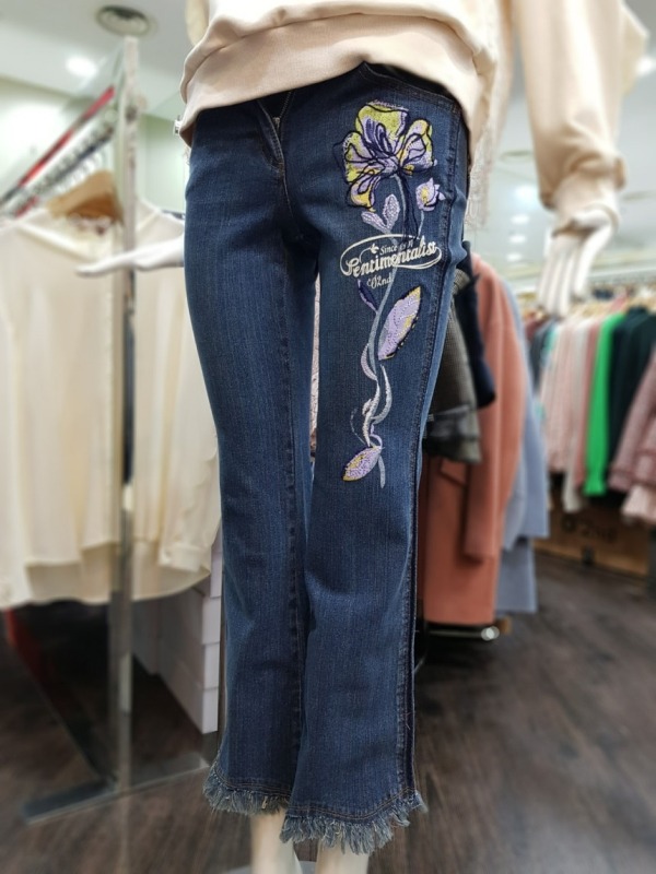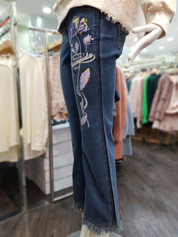 정면 및 후면 상단의 플라워 자수 디테일이 멋스러운 부츠컷 데님팬츠로밑단도 물결 모양으로 디테일 되어 착용시 이쁜 코디가 가능합니다.