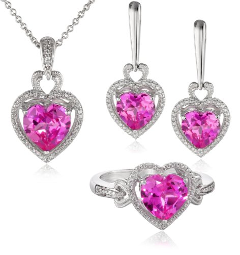 -. Title : Sterling Silver Heart-Shape Created Pink Sapphire Diamond Ring, Earrings and Pendant Necklace Jewelry Set
