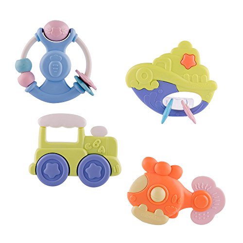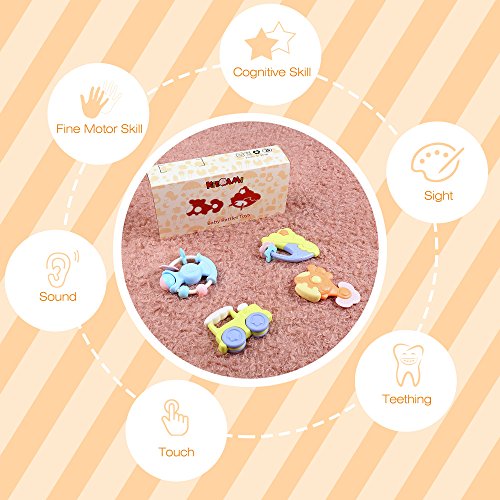 MULTI-COLORED RATTLE SET: 4 cute rattle toys in bright color, colorful beads make a pleasing rattle sound, good at develop baby’s sensory ability and musicality.
