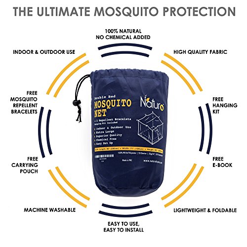 ? HANGING KIT + STORAGE BAG + E-BOOK & 100% SATISFACTION GUARANTEE: We here at NATURO have the customers' best interest at heart! That is why, we offer you the ultimate set that includes the mosquito net, 2 mosquito repellent bracelets, a full hanging kit (includes wall mounts and rope) and all these nice and tidy in a fine carrying bag. Last but not least you will get an E-book "Camping & Outdoor Recipes" and our 100% satisfaction guarantee!
