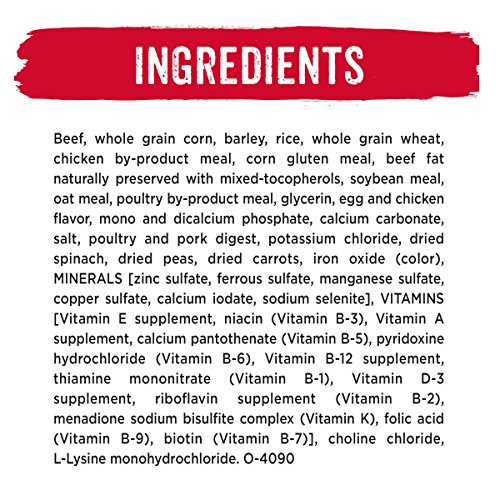 Ingredients:Beef, Whole Grain Corn, Barley, Rice, Whole Grain Wheat, Chicken By-Product Meal, Corn Gluten Meal, Beef Fat Naturally Preserved with Mixed-Tocopherols, Soybean Meal, Oat Meal, Poultry By-Product Meal, Glycerin, Egg and Chicken Flavor, Mono and Dicalcium Phosphate, Calcium Carbonate, Salt, Poultry and Pork Digest, Potassium Chloride, Dried Spinach, Dried Peas, Dried Carrots, Iron Oxide (Color), Minerals [Zinc Sulfate, Ferrous Sulfate, Manganese Sulfate, Copper Sulfate, Calcium Iodate, Sodium Selenite], Vitamins [Vitamin E Supplement, Niacin (Vitamin B-3), Vitamin A Supplement, Calcium Pantothenate (Vitamin B-5), Pyridoxine Hydrochloride (Vitamin B-6), Vitamin B-12 Supplement, Thiamine Mononitrate (Vitamin B-1), Vitamin D-3 Supplement, Riboflavin Supplement (Vitamin B-2), Menadione Sodium Bisulfite Complex (Vitamin K), Folic Acid (Vitamin B-9), Biotin (Vitamin B-7)], Choline Chloride, L-Lysine Monohydrochloride. O-4090.