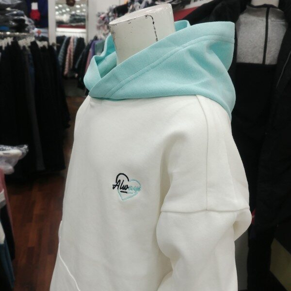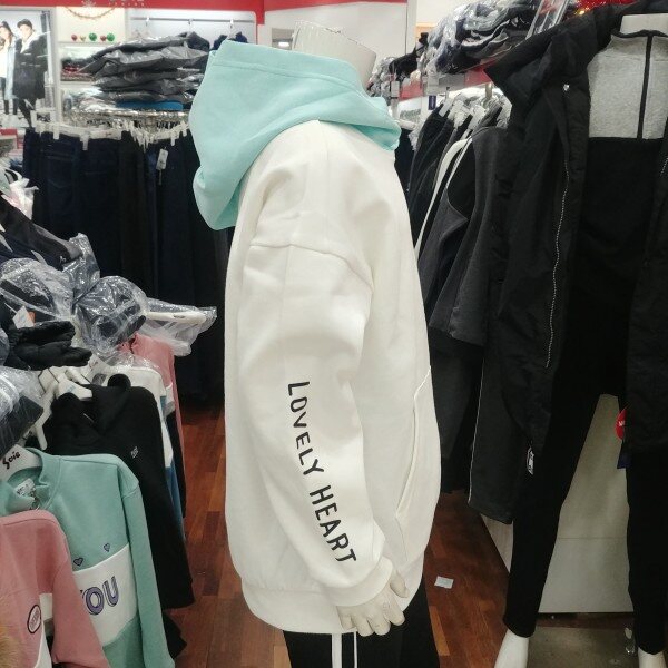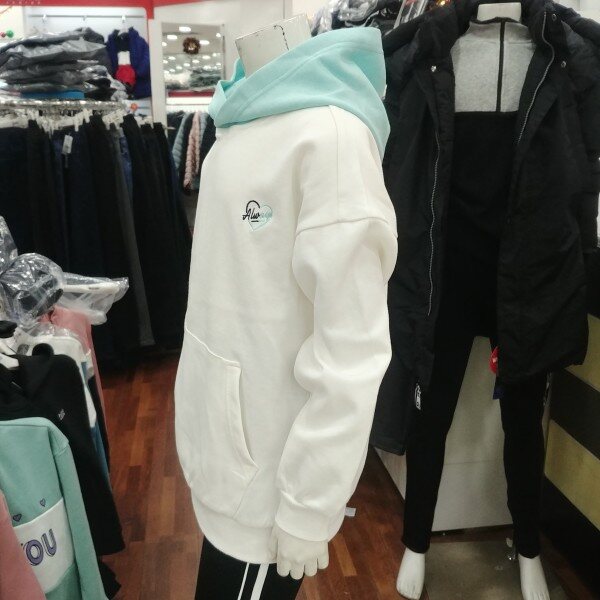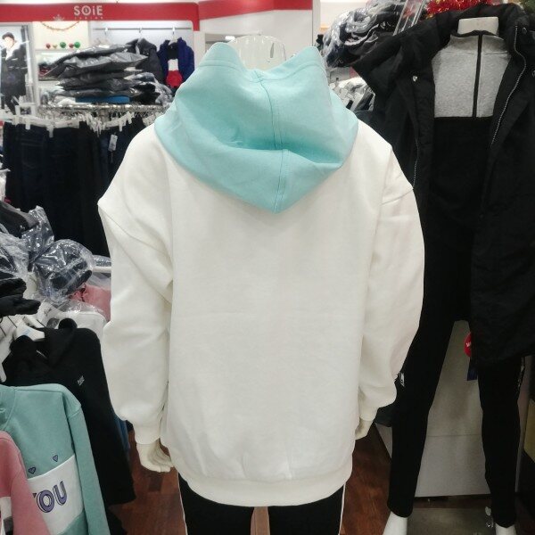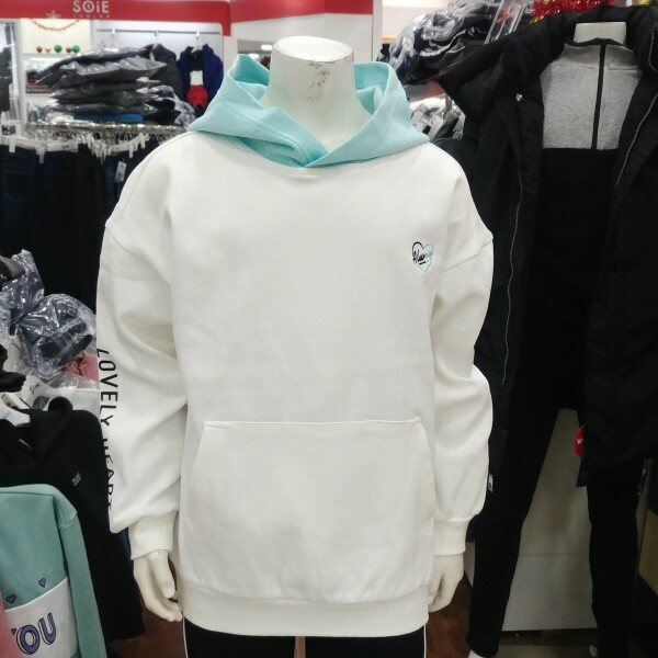 화이트 바탕에 민트 후드 부분이 돋보이는 여학생 전용 후드 티겨츠입니다.깔끔한 디자인이 좋습니다.