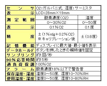 | 酸素濃度・温度の測定が可能です。小型、軽量でわずか194g。酸素濃度が18%以下になると、アラームが鳴り、警報します。タンク・井戸などの密閉された空間のO2測定や、マンホールなどの微生物が酸素を消費する場所、野菜貯蔵庫(暗室)などのO2測定に適しています。 |