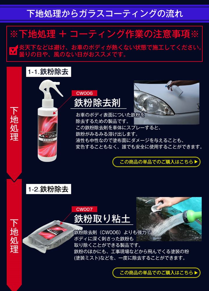 ●ガラスコーティングの効果を最大限に発揮するために、重要な下地処理を本格的に行える下地処理製品を4本セットにしました。