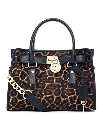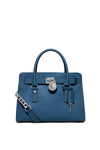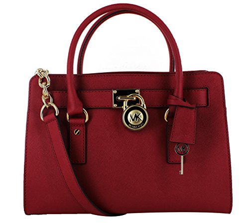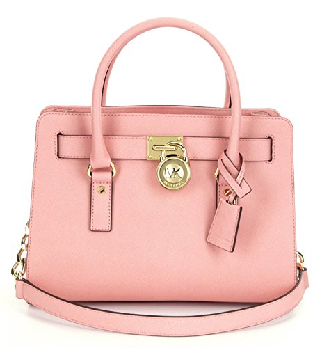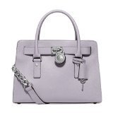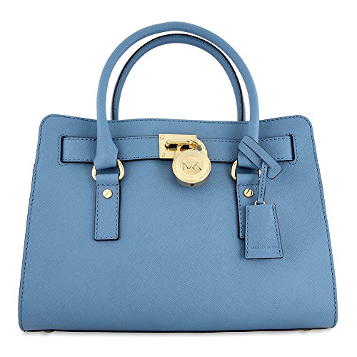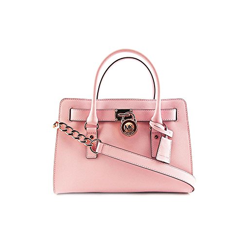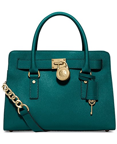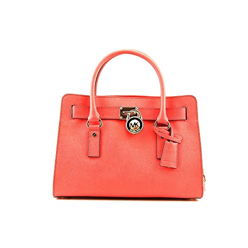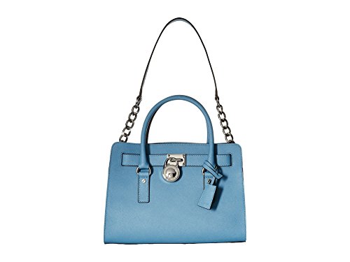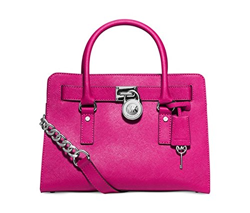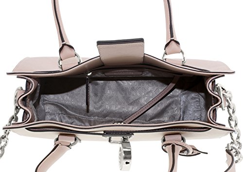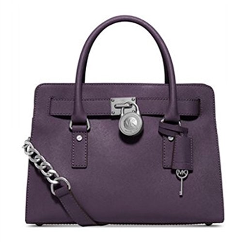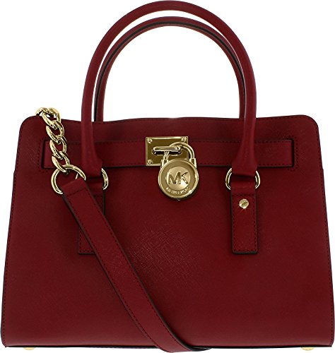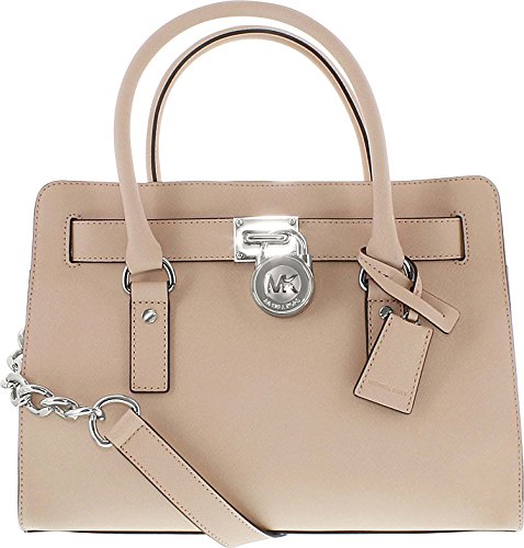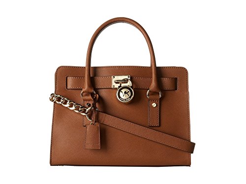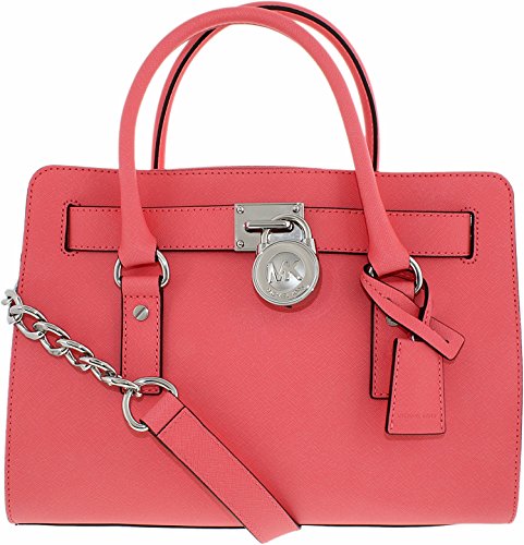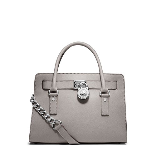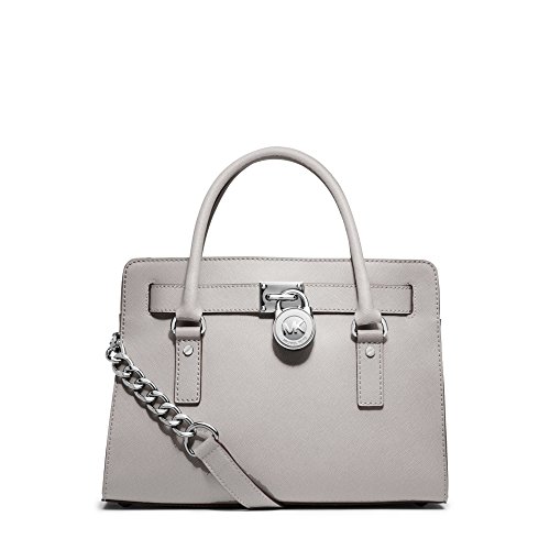 Soft leather and luxe hardware grace this gorgeous design from MICHAEL Michael Kors. Bold chain detailing and a prominent signature lock charm at front perfectly accent this femme satchel silhouette. Saffiano leather Double handles with 5" drop; shoulder strap with 11" drop Magnetic snap closure Gold- or silver-tone hardware; signature charm Interior features zip pocket, 2 slip pockets and key fob 12-3/4" W x 9" H x 5-1/2" D