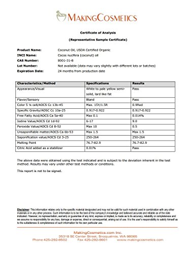 -. Binding : Misc. -. Brand : MakingCosmetics -. Feature : Extra virgin (unrefined), cold-pressed USDA certified organic coconut oil is extracted from the meat of the coconut / Pure & concentrated ingredient. Not a finished cosmetic product. Use as raw material for making cosmetics or add directly to finished skin care products. / High-quality product from the USA / Free Shipping / Supplied by MakingCosmetics Inc., an ISO certified & FDA registered ingredient supplier -. Label : MakingCosmetics -. Manufacturer : MakingCosmetics -. MPN : OIL-COCO-02-500 -. PackageQuantity : 1 -. PartNumber : OIL-COCO-02-500 -. ProductGroup : Beauty -. ProductTypeName : BEAUTY -. Publisher : MakingCosmetics -. Studio : MakingCosmetics -. Title : Coconut Oil, USDA Certified Organic - 17.6oz / 500g