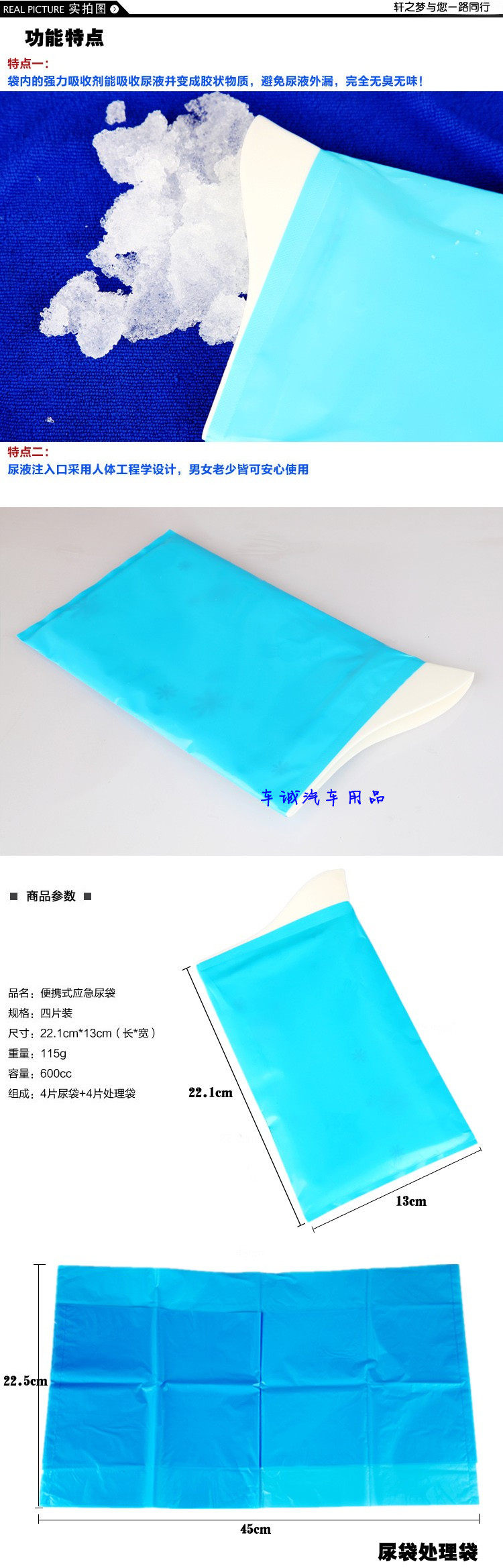 1, emergency urine bag has super absorption bag, super absorbent polymerscontaining particles, can rapidly absorb urine and other liquid in about 1 minutes,and then become gelatinous substance, avoid urine liquid overflow, no odor.