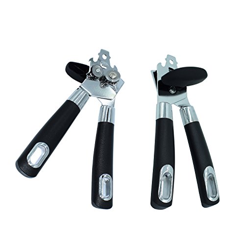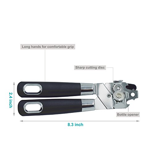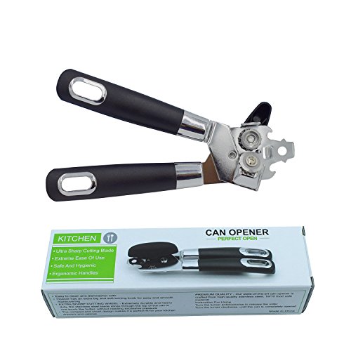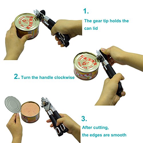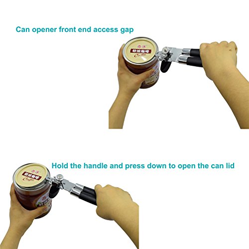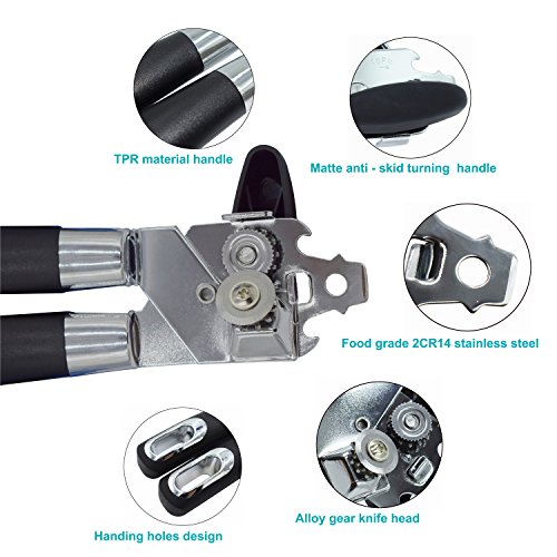 Easily Use:This can opener follows the cutting wheel principle with a hardened Knife and traction wheel. also with two bottle opener, The product also includes a cap and lid lifter to prevent injury When separating the lid from the can. Easily turn knob makes opening cans an easy task