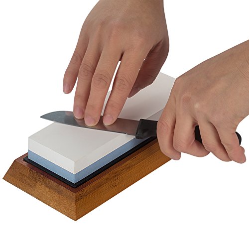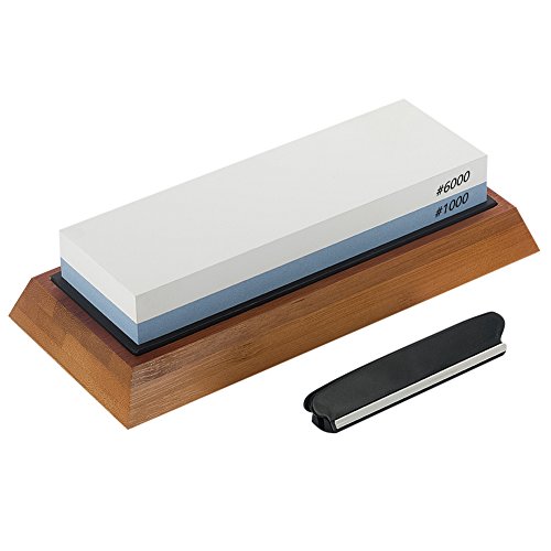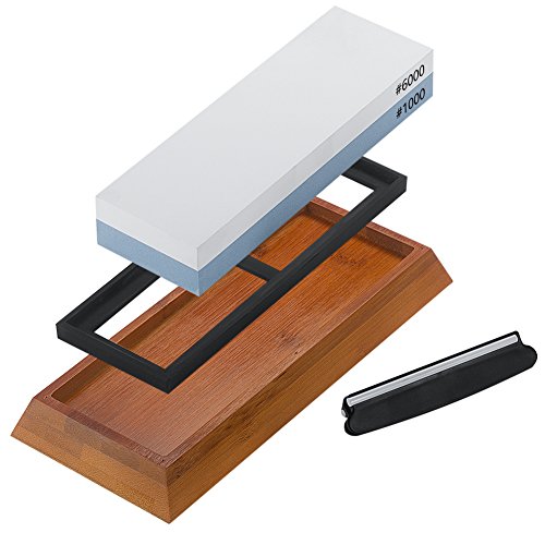 Bekith knife sharpening kit comes with double sided (#1000/ #6000) whetstone, bamboo base for holding the stone, knife sharpening angle guide