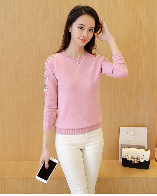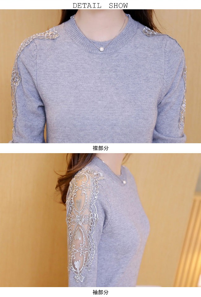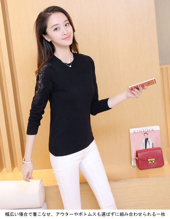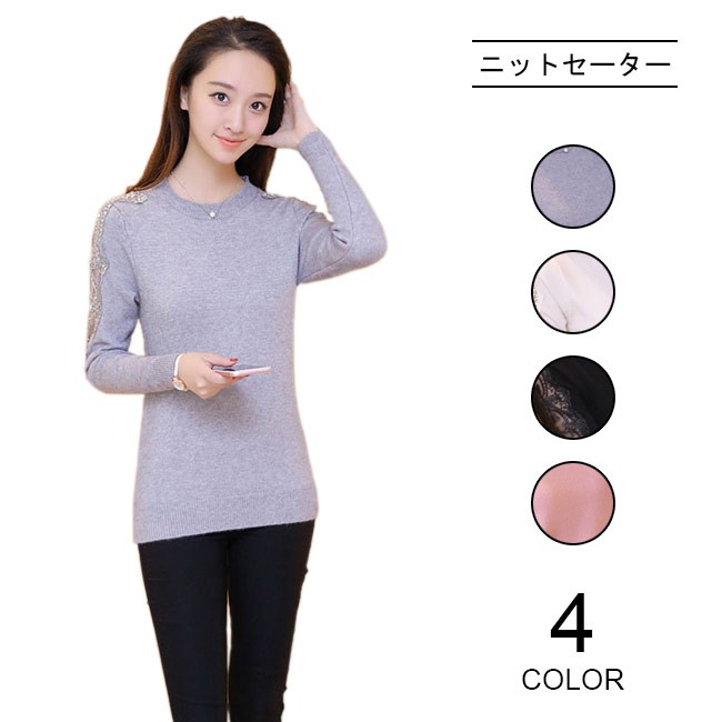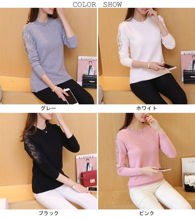 ニットセーター レディース 長袖 ニット トップス 丸襟 レース 春秋物 秋冬物 女性用 ニット セーター シンプル カラバリ 着まわしレディース用のニットセーターが登場ゆったりし過ぎずタイト過ぎずのシルエットは美しいボディーラインを引き立て、とても優雅な雰囲気を醸し出す肩と袖部分に透明なレース付きのデザインは一番のポイントとなり、甘いレトロ感と女性ならではの色気を漂わせるシンプルなデザインに4色展開が用意され、ファッションをより自由に楽しめる幅広い場合で着こなせ、アウターやボトムスも選ばずに組み合わせられる一枚カラー:グレー ホワイト ブラック ピンク素材 ポリエステルサイズ(cm) FF 肩幅34 着丈57 バスト80-110ご注意:※サイズは平置きサイズです。素人採寸ですので、若干の誤差がございます、ご了承ください。