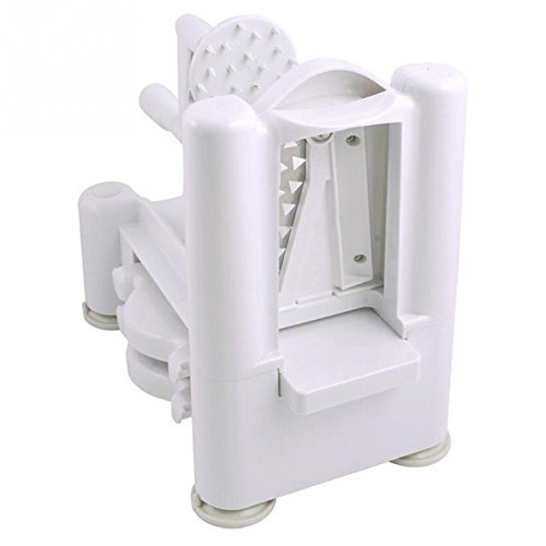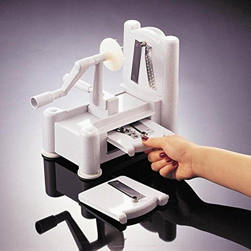Feature : . Hand operated--no batteries or AC outlet necessary / 2. Creates spiral cuts and vegetable or fruit noodles in 30 seconds / . The slicer is a very easy-to-use tool that makes zucchini noodles, curly fries / cucumber ribbon strands, spiral apple strands and more / Comes with three blades: a shredder blade (1/8" spacing), a chipper blade