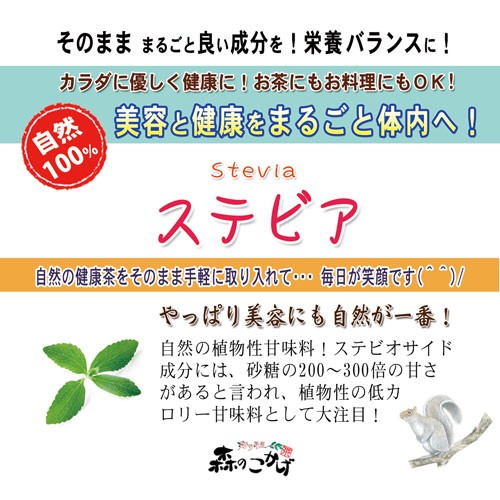 | ステビア |  | | stevia ステビアは、パラグアイ原産のキク科の多年草。古来パラグアイの原住民により天然甘味料として使用されてきました。 ステビオシド(ステビオサイド)やレバウディオサイドAといったテルペノイドの配糖体を含んでいるため、甘いリーフの甘味料として用いられています。 | 健康もサポートする天然のスーパー甘味料! 甘味料として知られるステビアは、砂糖の200~300倍の甘さがあるとされ、カロリーは約90分の1。 | ◆ステビアには、カラダの健康にもさまざまな良い所があるので、健康維持としてもご利用ください。 ※妊娠中の方や授乳中の方は安全性については充分な情報がないので、多量の摂取は避けた方がよいでしょう。 また、キク科植物に過敏な人ではアレルギーを起こす可能性がある。 |  | | | 本品は、熱湯を注ぐか、お料理などで過熱してご飲食下さい。 | | | 粉末の状態 |  | | ・・原産国・・・・・ インド、中国 農薬検査等には、全てクリアしておりますので、ご安心してお召上がり頂けます。加工は、国内で行っております。 ・・備考・・・・・ 保存方法:開封前 直射日光、高温多湿を避ける開封後密封、低湿度 ・・有効成分・・・・・ テルペン配糖体 ・・カフェインの有無・・・・・ ノンカフェイン飲料 | | |