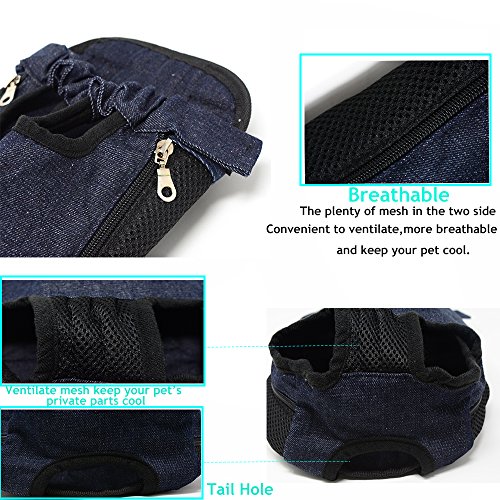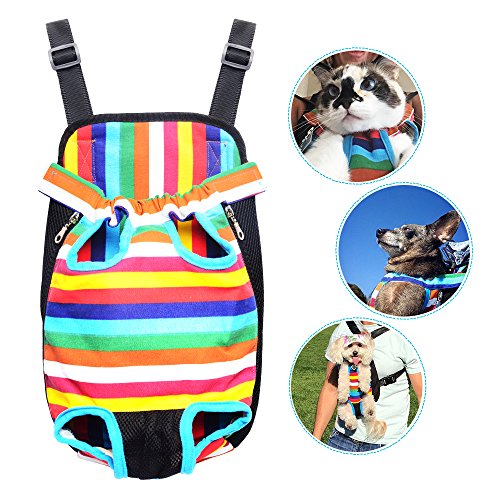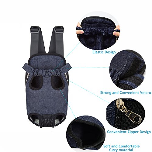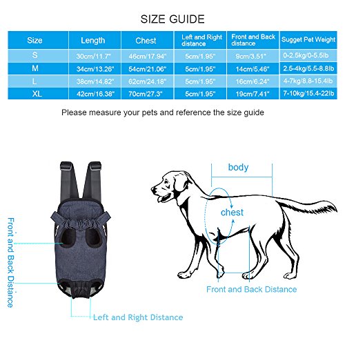 -. Feature : ▶The front pack design convinient you to take care of your dog easier, and you can take it as back pack, while keep your hands free. idea for cycling, traveling, shopping, camping and walking outside with your lovely pet. just get it and take your dog or cat enjoy more adventure togrther. / ▶This pet front carrier made from sturdy Canvas and breathable mesh material, soft cotton lining, sturdy, durable, lightweight, comfortable, two mesh side panel allow maximum air circulation, Breathable mesh in the crotch position to protect the pets' private parts better / ▶Head out,Legs out and tail-out design can keep your pet safe and comfortable when the dog or cat stay in this front carrier, the zipper and elastic openings allowing you to fit your small dog or cat inside convenient and comfortably. / ▶Adjustble shoulder strap and padded on the carrier back be worn on you front or back, reducing the pressure on your shoulder and take care of your dog or cat at any time. Release buckles on the end of straps convenient you quick installation. / SIZE GUIDE--There are M/L/XL three size are available,M: chest: 54cm/21.06", Front and Back distance: 14cm/5.46", Suggest pet weight:5.5-8.8Ib; L: chest : 62cm/24.18", Front and Back distance: 16cm/6.24", Suggest pet weight:8.8-15.4Ib; XL:chest: 70cm/27.3", Front and Back distance: 19cm/7.41", Suggest pet weight:15.4-22Ib.★Note: please be sure to take note of all the dimensions as well as weight recommendations before purchasing this dog carrier.