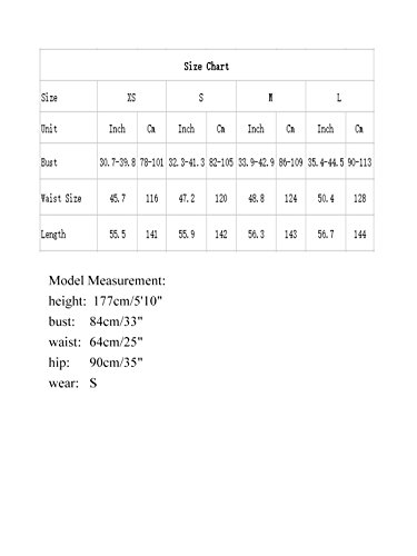 : XS: Bust: 30.7-39.8", Waist Size: 45.7", Length: 55.5" S: Bust: 32.3-41.3", Waist Size: 47.2", Length: 55.9" M: Bust: 33.9-42.9", Waist Size: 48.8", Length: 56.3" L: Bust: 35.4-44.5", Waist Size: 50.4", Length: 56.7"