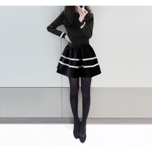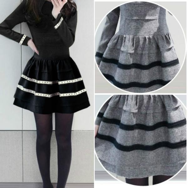 ガーリー長袖 Aライン ボーダーフレアワンピース ブラック/L
