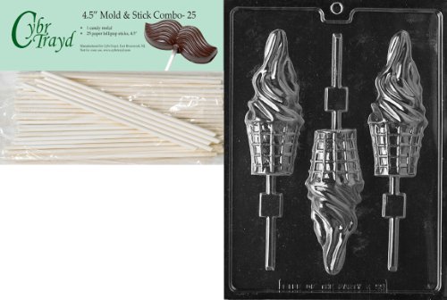 Cybrtrayd 45St25-K099 Ice Cream Cone Lolly Kids Chocolate Candy Mold with 25 Cybrtrayd 4.5-Inch Lollipop Sticks