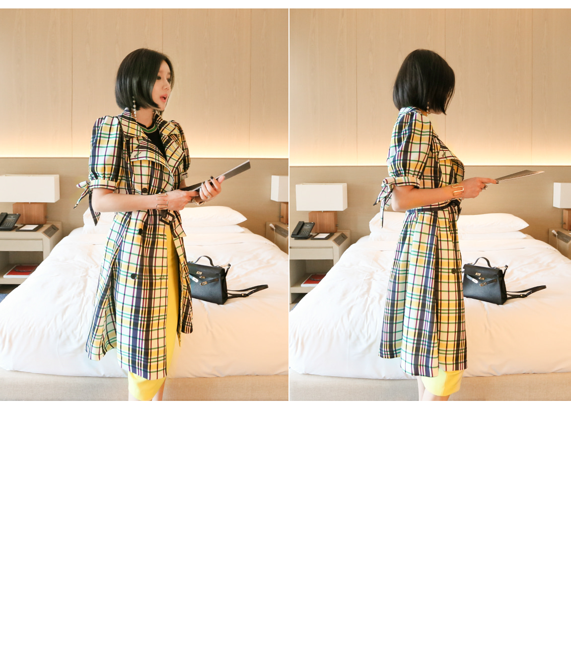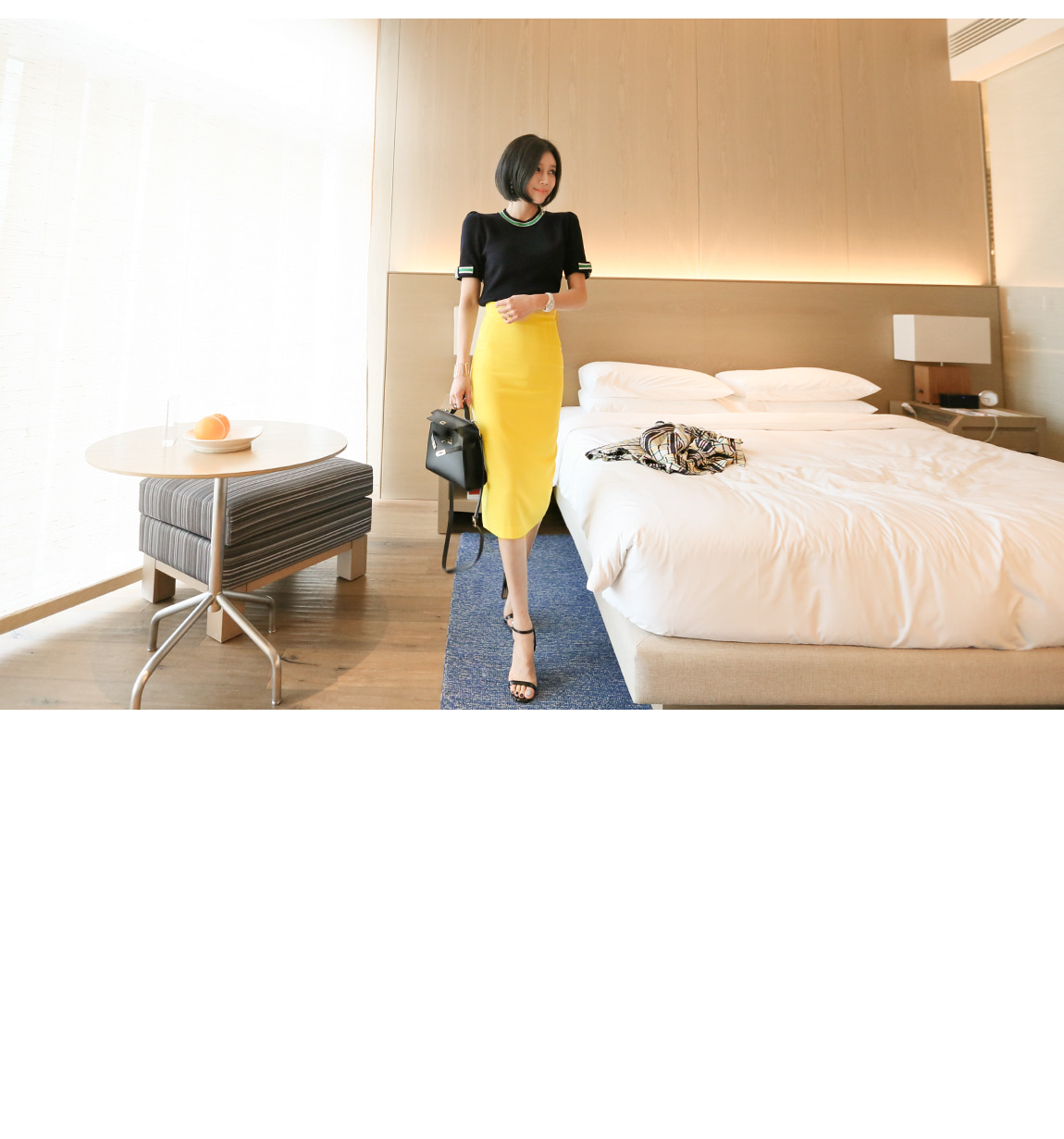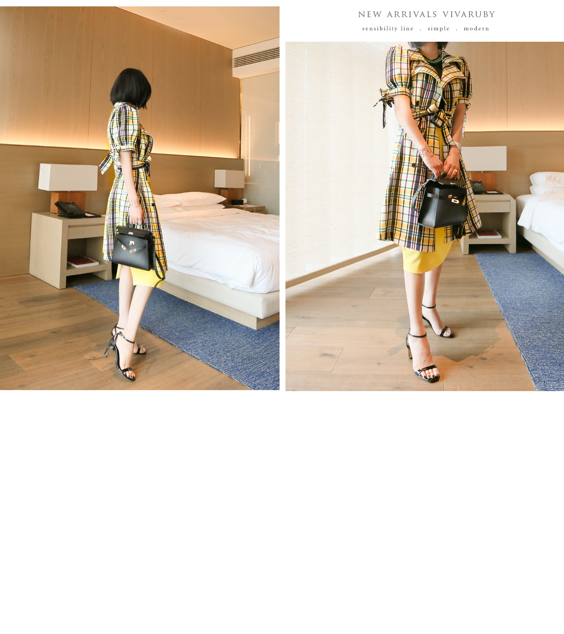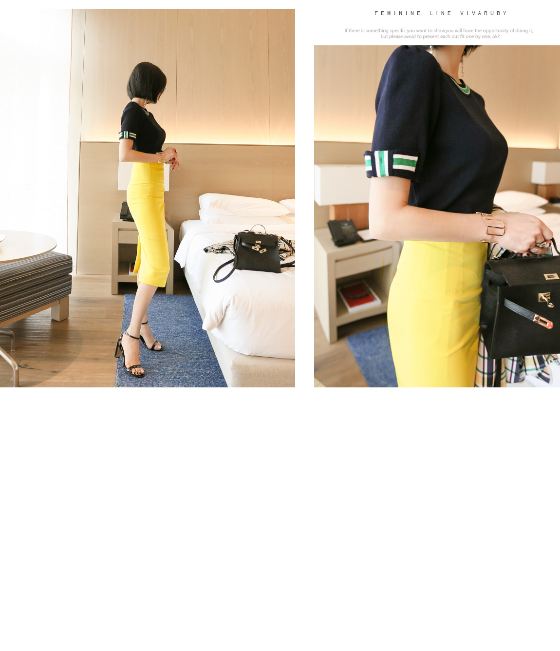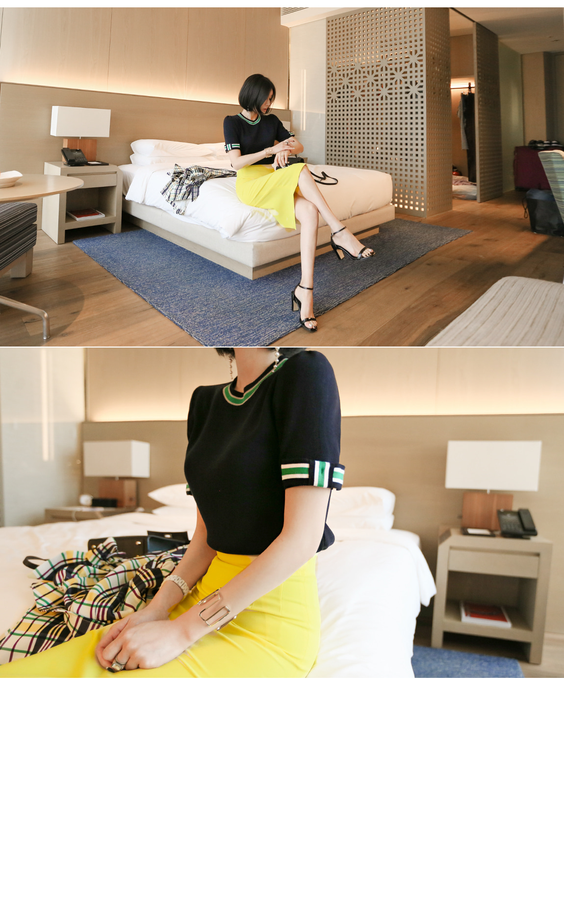 네크라인과 소매의 배색 디테일로 트렌디한 포인트를 주었어요