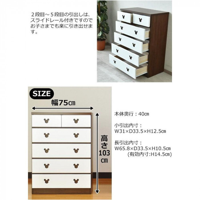 | ミッキー型のくり引き手がとってもキュート!!引き手は、本体と同色のカラーですのでアクセントになります。お部屋の雰囲気にあわせて、本体色ブラウン・ナチュラルの2色からお選びください。 |