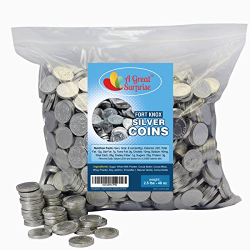 -. Feature : Fort Knox Silver Coins are premium 1.1 inch milk chocolate coins made in Holland. Melt in your mouth goodness! / These half-dollar sized coins are perfect for candy buffets, pirate themed parties and everyday snacking. / Buy in bulk to save money. Approximately 150 pcs per pound. Includes 2.5 lbs. Resealable bag for easy storage. / Great candy that will be loved by kids of all ages (and adults too). Enjoy these sweet treats with many enticing flavors of the classic candy you crave. / Individually wrapped. Kosher. Items are repackaged in a facility that may contain milk, soy, peanuts, tree nuts, eggs, wheat and all other allergens.