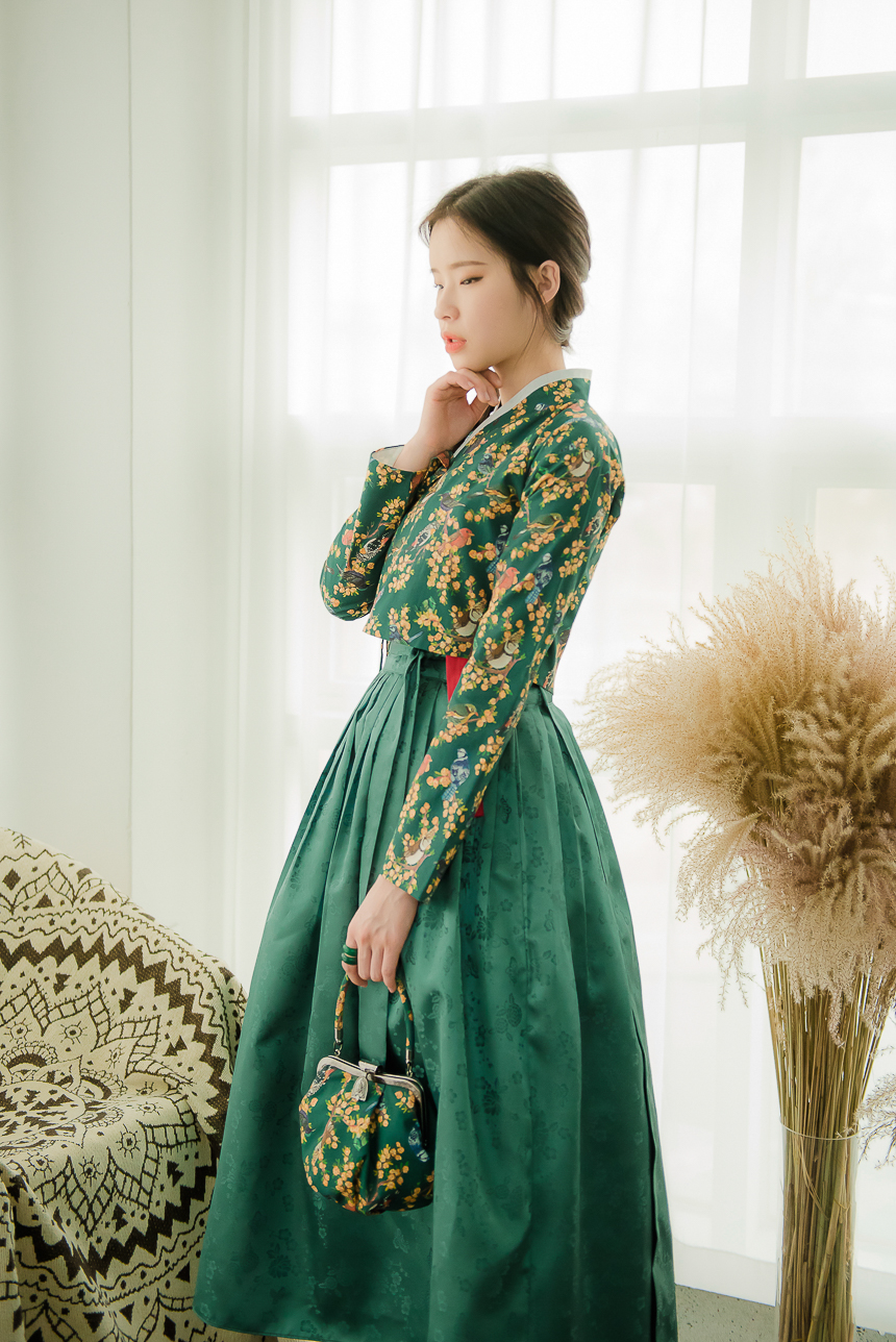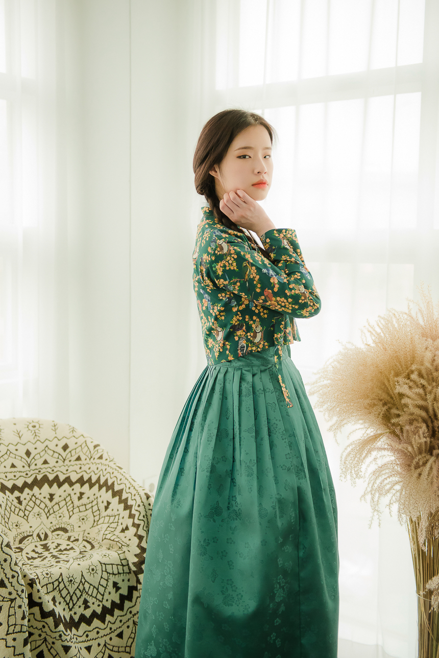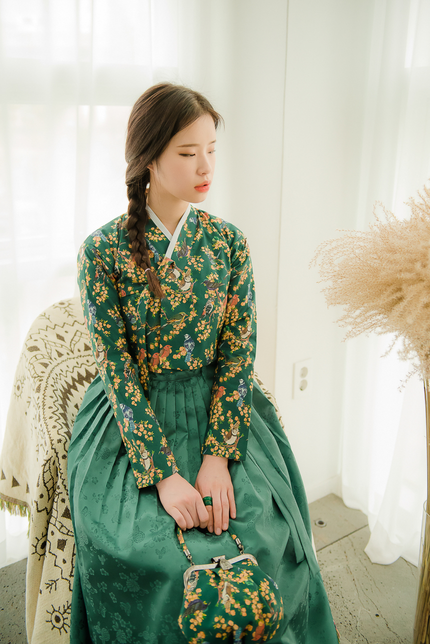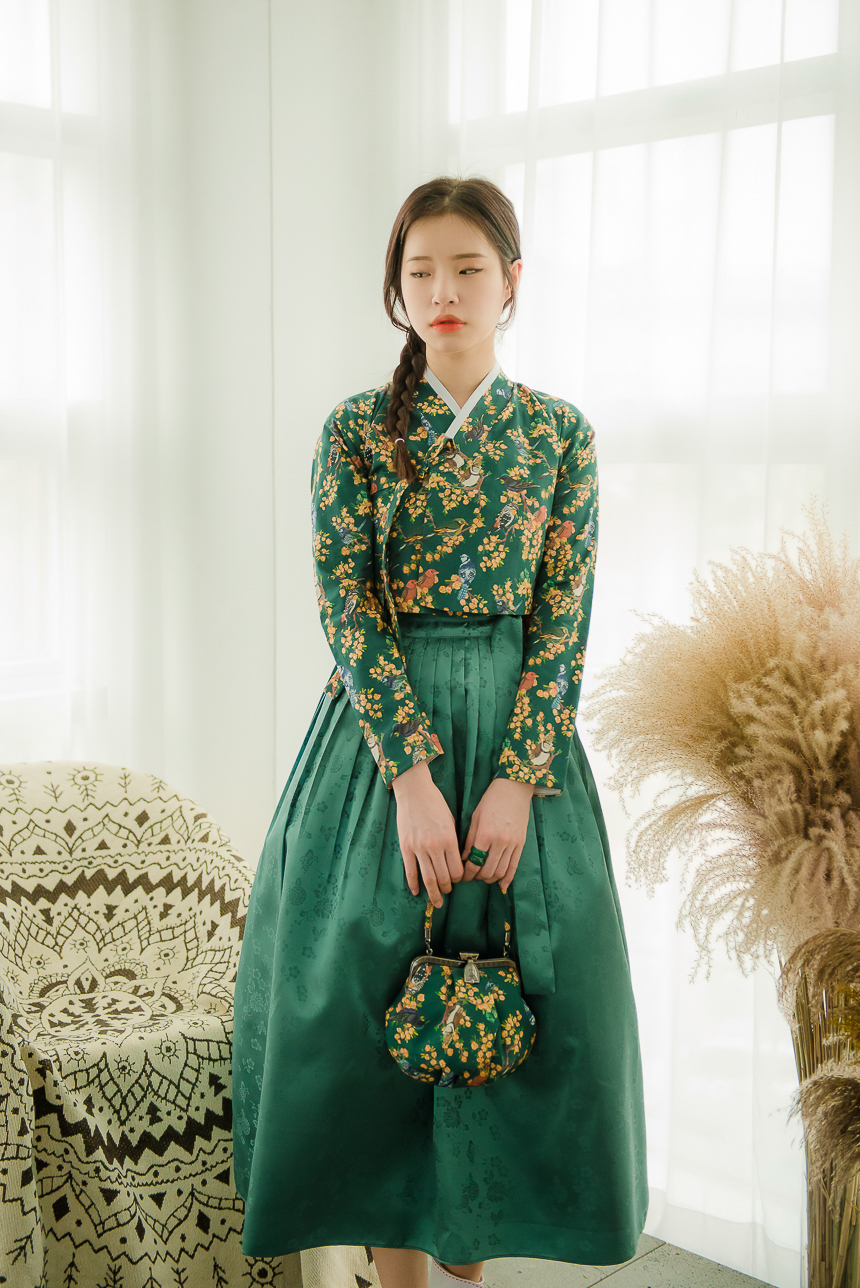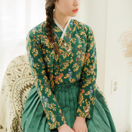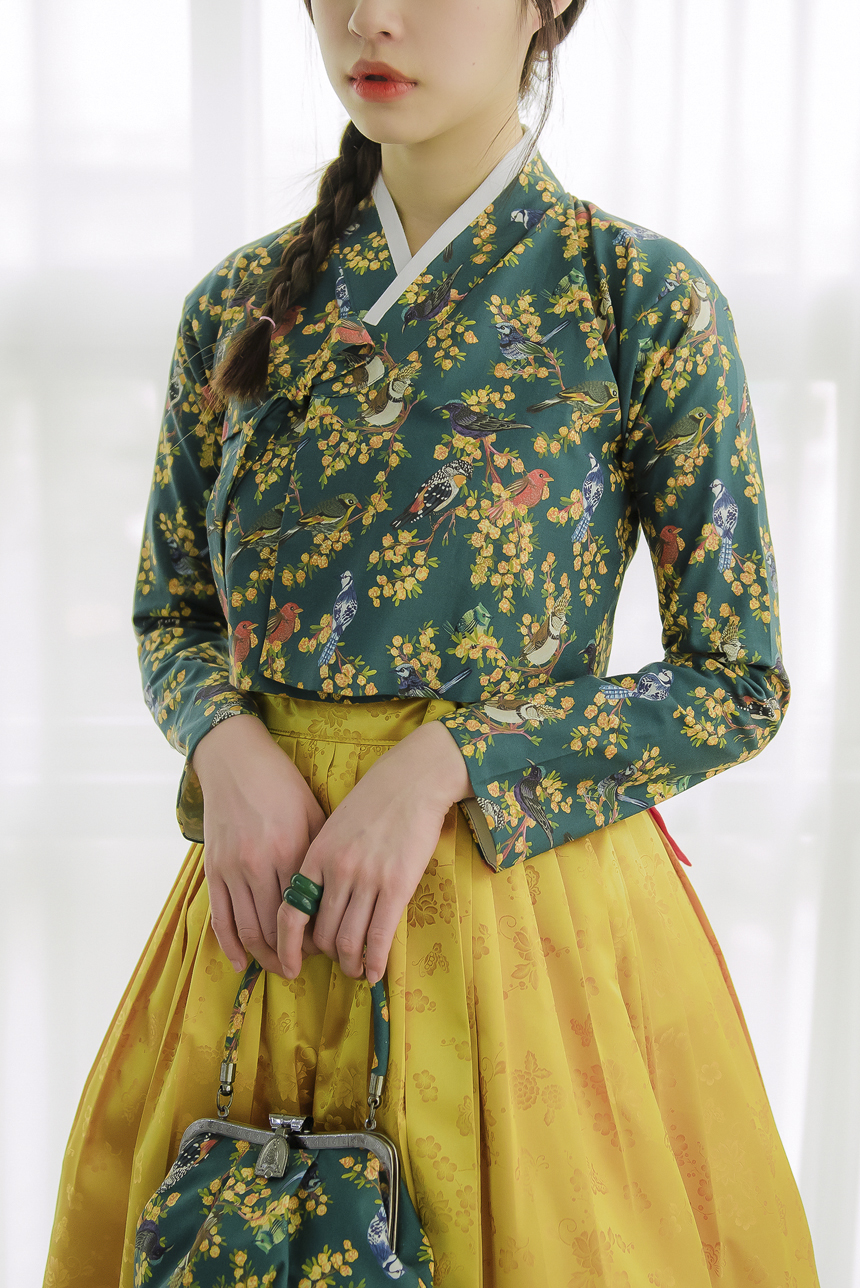 깊은 초록 숲속의 신비로운 산새를 모티브로 표현한 산새 저고리 입니다.