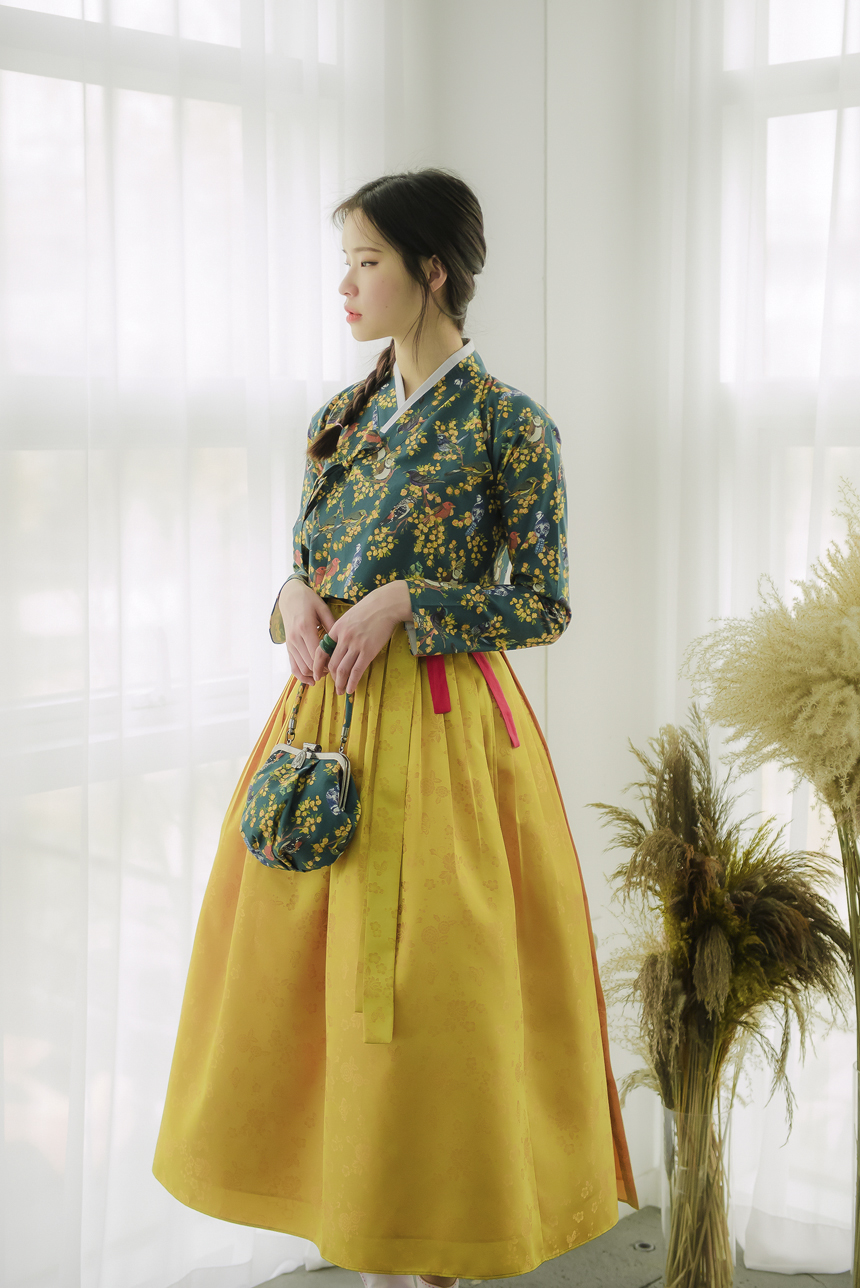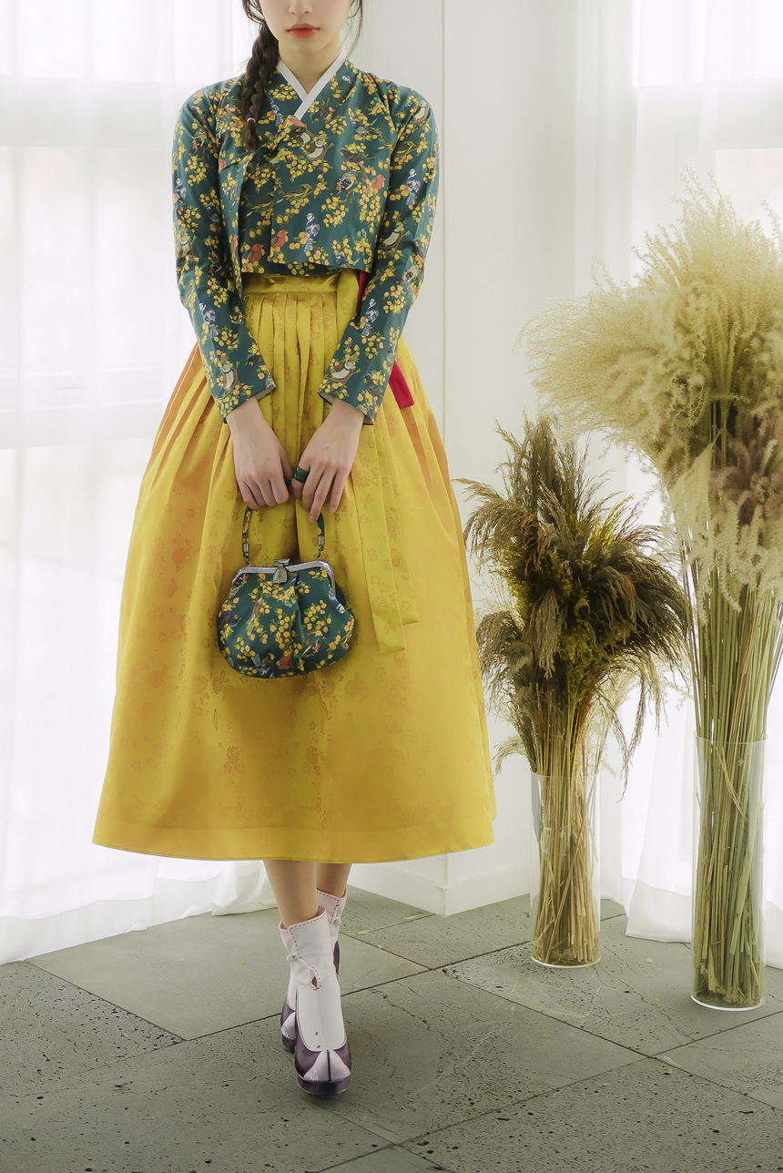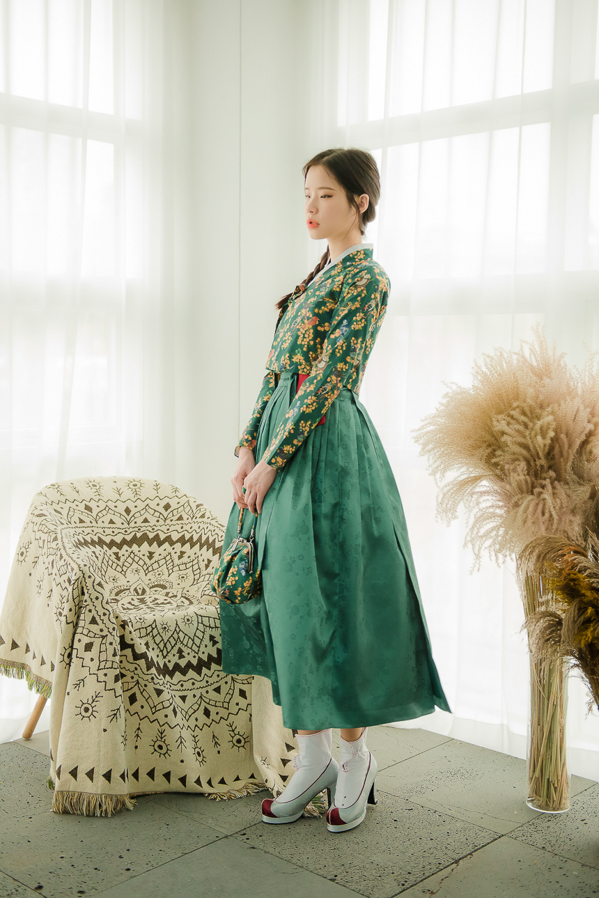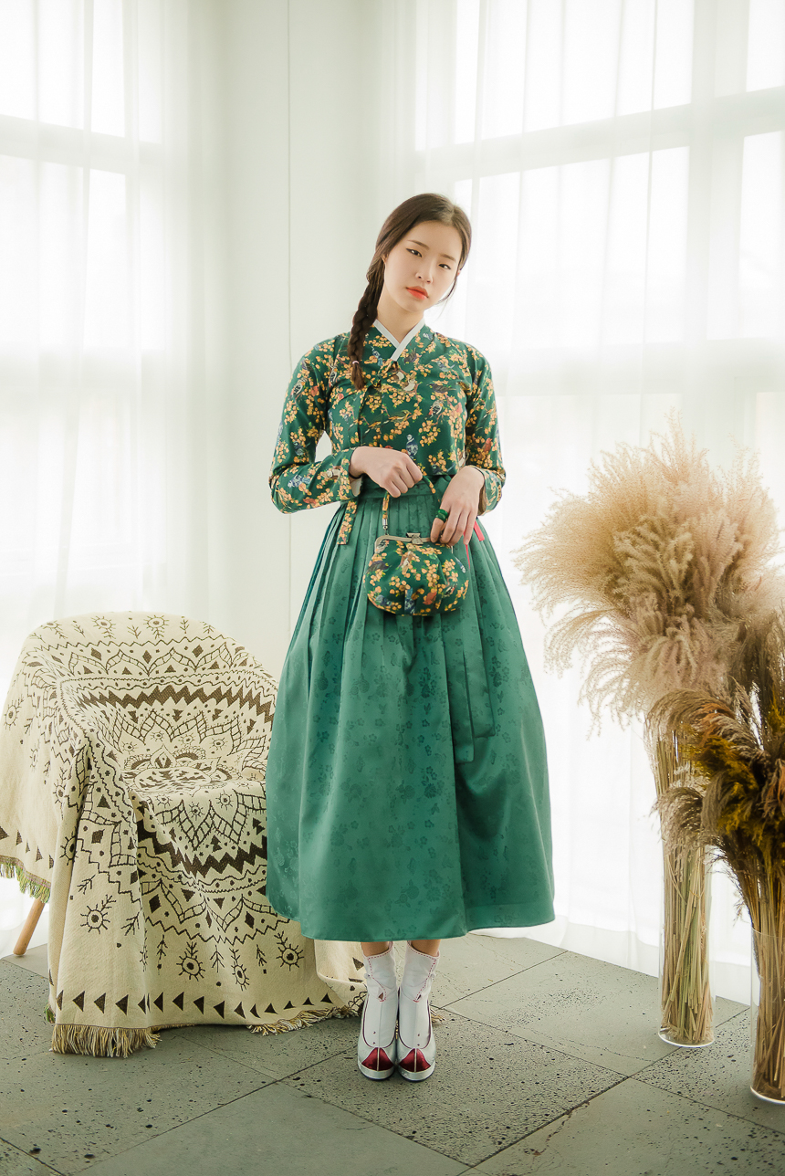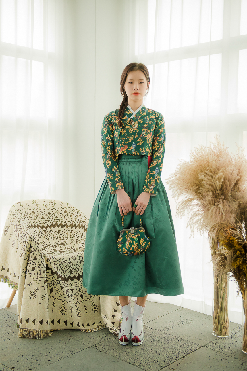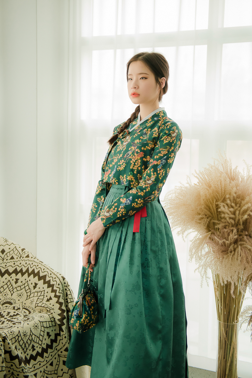 깊은 초록 숲속의 신비로운 산새를 모티브로 표현한 산새 저고리 입니다.