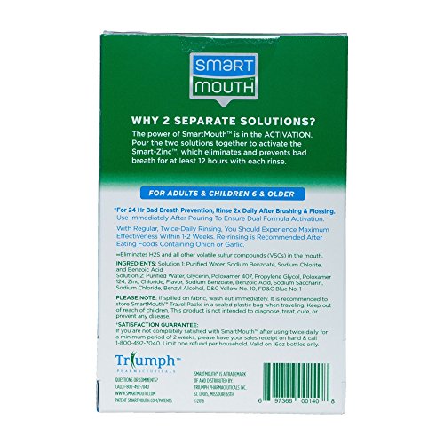 Studio : Smart Mouth Publisher : Smart Mouth Binding : Health and Beauty Product Description THE BAD BREATH EXPERTS SmartMouth has specialized in bad breath prevention since 1993. It was then that our founder, Dr. Marvin Cohen, recognized the need for a real solution to bad breath. description change to :Our SmartMouth Travel Mouthwash Packets are the perfect take along treatment for bad breath. Whether you are battling morning breath, an illness, or a spicy meal, our Zinc Ion Technology eliminates halitosis scientifically, and freshens breath for a full 24 hours. These travel-size packets are TSA approved and fit nicely in your luggage, backpack, purse or even pocket. See bullets and images for more information. 0