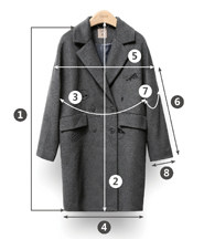 | 尺码 | ①前衣长 | ②后中长 | ③胸围 | ④下摆围 | ⑤肩宽 | ⑥袖长 | ⑦袖臂围 | ⑧袖口围 | ||