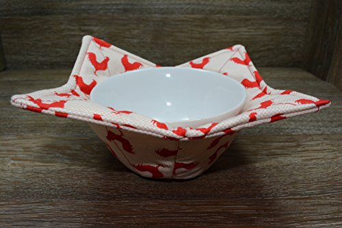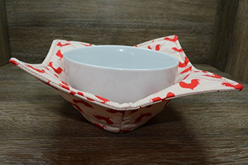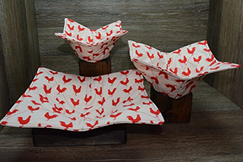 Product Description Microwave cozy set includes 1 small bowl cozy (Approx 6.5" sq), 1 medium bowl cozy (Approx 8" sq), 1 dinner plate cozy (Approx 10" sq.) The dinner plate cozy can also be used for round casserole dishes and the small size is great for coffee mugs! These microwave cozies are the perfect solution to handling super-hot dishes. Cooking and reheating food in a dish cozy makes life so much easier! Place your microwaveable dish inside the bowl cozy and put the whole thing in the microwave to heat. To take the bowl out, you simply grab the corners of the cozy. We found that our kids can now get their dishes out of the microwave safely. Cozies will also protect your fingers from the cold when holding a bowl of ice cream and are great for protecting your table. You can also use a cozy placed on top the dish you are microwaving to help steam food. MATERIALS: * 100% cotton fabric * 2 layers of 100% cotton batting * 100% cotton thread Please be advised: Bowl cozies must only be used in microwaves with a rotating base. To avoid scorching or burning, please make sure cozy freely rotates in your microwave. Never leave microwave unattended. Make sure cozy is clean with no pieces of food attached. Do not microwave cozy for more than three minutes. Cozies can be machine washed on delicate cycle. Reshape and allow to air dry for best results. Please let us know if this is a gift, and we will ship without a packing slip enclosed! 0