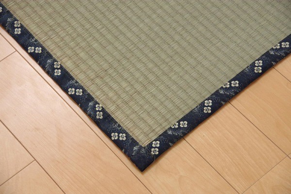 い草は長いものほど高級になります。い草は先端部分が赤茶色く、根元が白く真中が青(緑)色です。真中の良質な青の部分を多く使用するほど、丈夫で綺麗な仕上がりとなります。またイ草は使用するうちに日焼けをしますが、真中の青の部分を多く使用したものほど、全体が綺麗にムラなく日焼けし、味が出ます。こちらの商品は畳表と同じ織り方の糸引織で仕上げました。双目織りと比べて、い草の打ち込み本数が多いため丈夫です。表面が滑らかなので、ホコリなどがたまりにくいのが特徴です。長くご使用されたい方や、耐久性をお求めの方には糸引織をおすすめします。