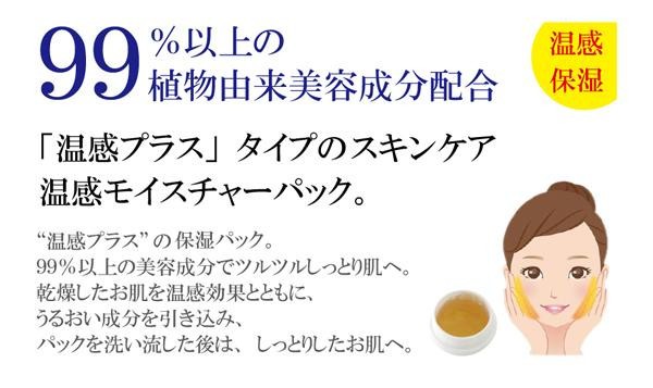| 「温感プラス」の保湿パック。99%以上美容成分でツルツルしっとり肌へ。乾燥したお肌を温感効果とともに、うるおい成分を引き込み、洗い流した後は、しっとりしたお肌へ。 |
