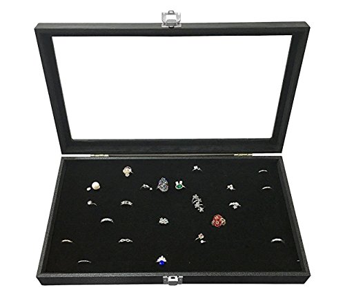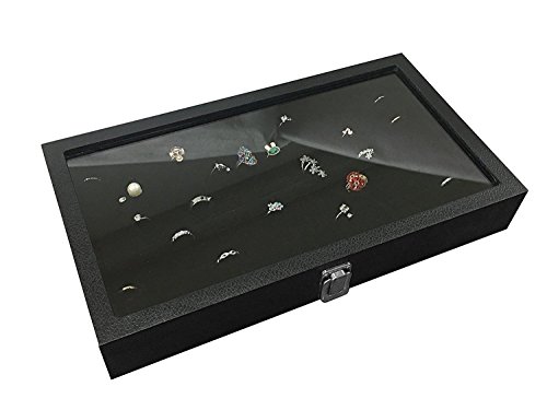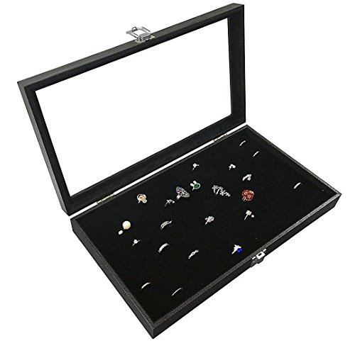 RJ Displays- Glass Top Black Jewelry Display Case 72 Slot for Rings, pendant, Earrings and Gemstone Tray. Comes with Free Quality Jewelry Polishing Cloth