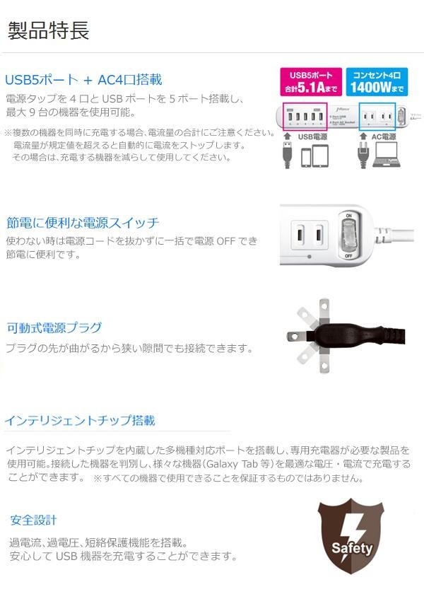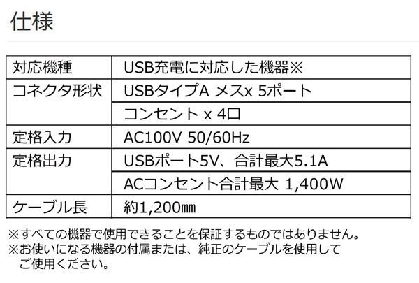 5つのUSBポートと4つのACコンセントを搭載し、一度で複数の機器に給電・充電することが可能な電源タップ。USBで充電しつつ、コンセントを使用することが可能です。オフィス、会議室など人が集まるところでの使用に最適です! |