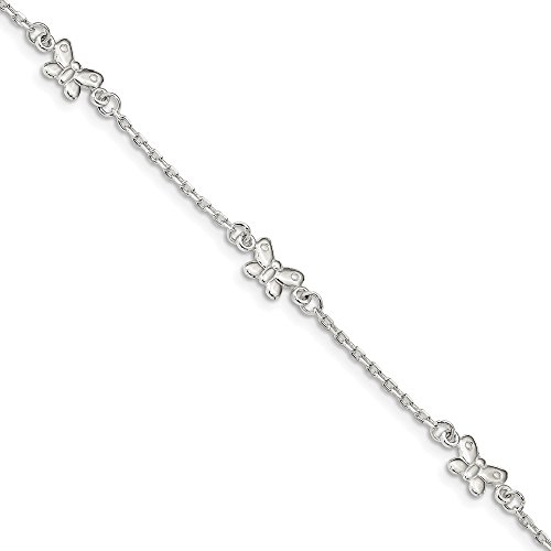 Solid 925 Sterling Silver Polished Butterfly 9in with 1in ext Anklet 9" - with Secure Lobster Lock Clasp (1.5mm)