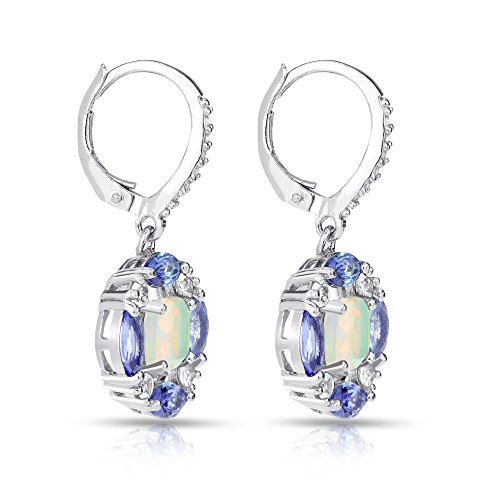 FEATURE - Earrings feature multi color gemstones; cushion-cut Ethiopian opal center stone surrounded by marquise shape tanzanite and round white topaz stones.