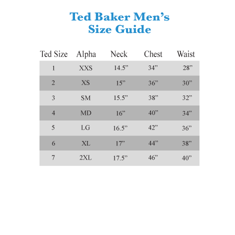 Ted Baker's unconventional size charts are all part of the brand's unique culture. As a rule of thumb, Ted recommends you order one size up from usual to ensure your purchase fits the bill.
