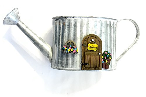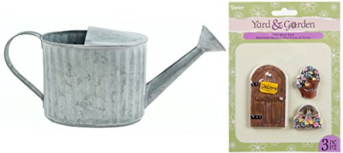 Galvanized Watering Can Container with Fairy Garden Door, Window & Flower Pot Accessories for DIY Miniature Garden
